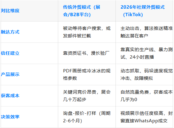 2026年的采购经理(Plant Manager)已经是 85后甚至90后,他们习惯于在采购前通过视频进行“产品验尸”。下表揭示了传统与社媒模式的巨大差异: