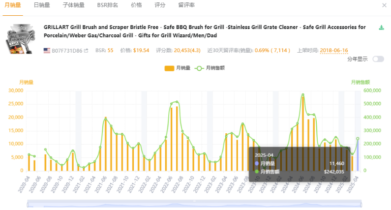 最新市场数据显示,一款来自Amazon美国站的烧烤刷产品表现惊人。据工厂精灵数据统计,该产品在短短14天内销量突破11460单,销售额超过24万美元,毫无悬念地登顶该产品热销榜榜首。