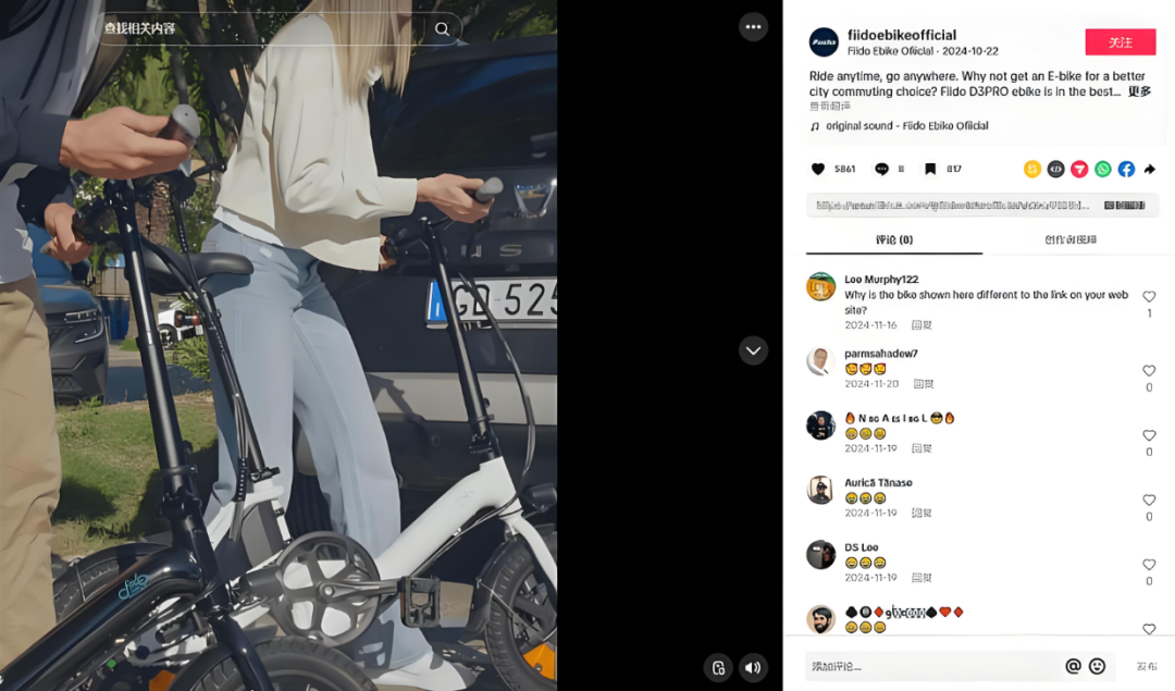 二是产品功能与性能的直观呈现。一条播放量高达410万的爆款视频,完整记录了EP2 Boost折叠电动自行车的展开过程。可调节座椅、实时电量显示、加宽胖胎的减震效果……所有核心卖点都在一分钟内清晰传递。评论区里,不少用户直接留言询问价格和购买方式,种草与转化一气呵成。