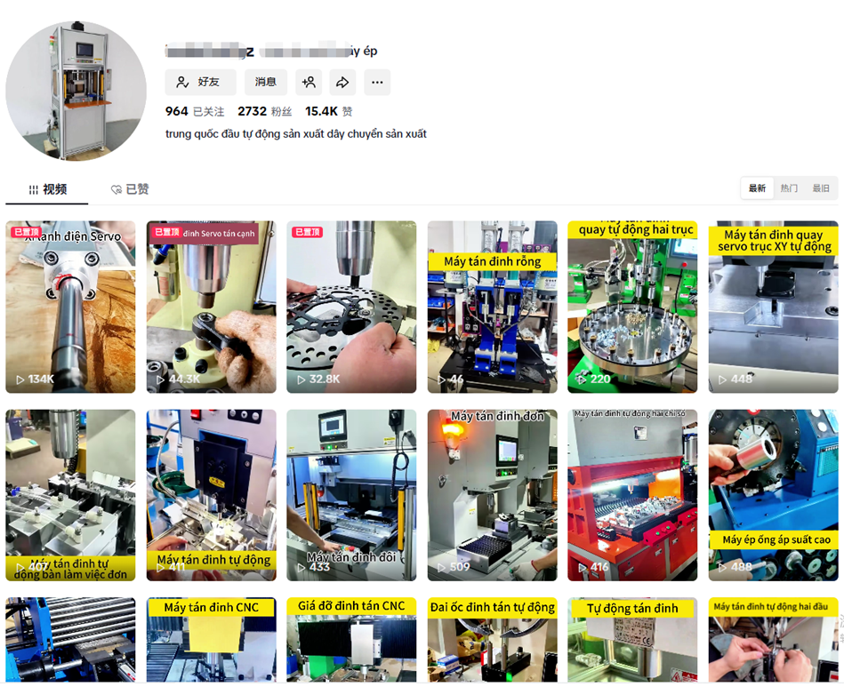 账号定位要精准,避免泛流量:聚焦“伺服压力机工厂+产品+定制服务”,昵称包含核心关键词(如“Servo Press Factory China”)(“Chinese Servo Press Manufacturer”),清晰告知海外采购商你的身份。