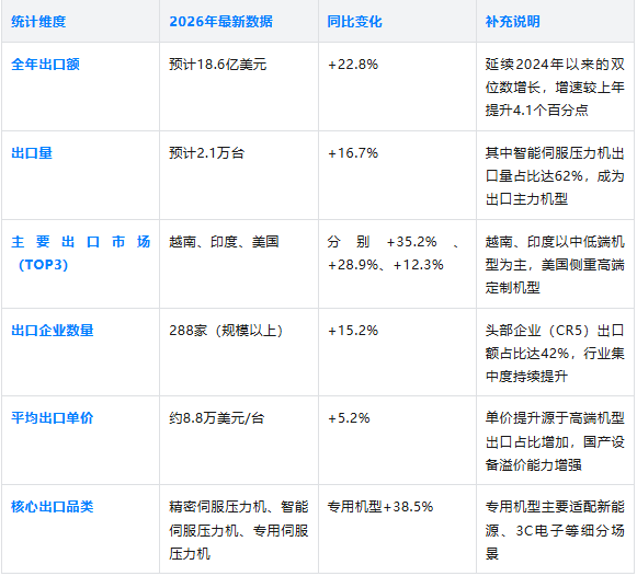 注:数据综合中国机床工具工业协会2026年一季度预测、Volza全球出口数据(2026年3月最新),仅供伺服压力机工厂外贸布局参考。