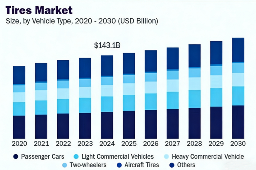 全球市场研究机构Grand View Research的数据显示,2024年全球轮胎市场规模约为1430.6亿美元,预计到2030年将增长至1739.3亿美元。伴随全球汽车行业的稳步扩张,轮胎需求的天花板远未到来。