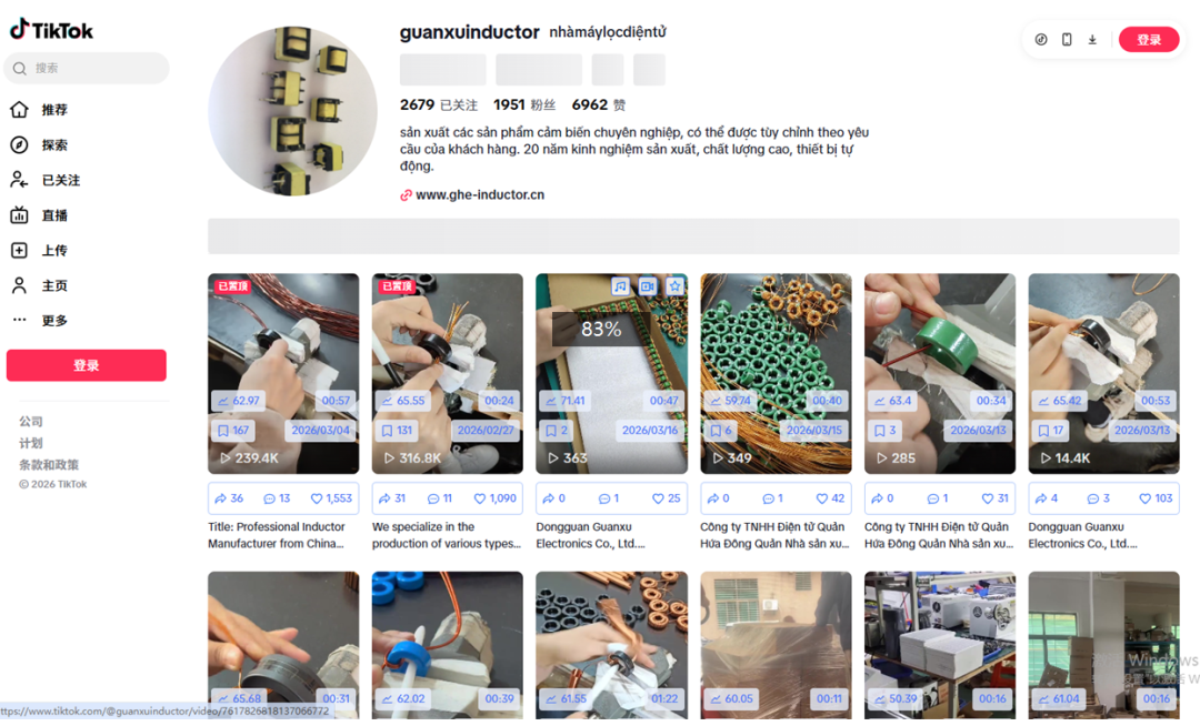 5. 数字化营销的先发优势目前TikTok上B2B工业品内容仍是一片蓝海。当大多数工厂还在观望时,率先布局社媒的电感工厂能抢占行业关键词流量,获取低成本的精准客户 。