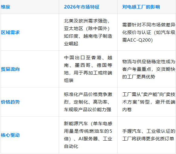 当前全球电感市场呈现“制造在中国,需求在全球”的鲜明特征。中国不仅是全球最大的电感生产基地(占全球产量超70%),也是最大的出口国。2026年的外贸市场呈现以下几个特点: